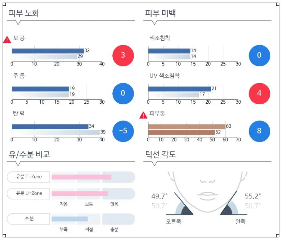 피부과에 방문했을 때 흔히 진행하게 되는 피부측정과 유사한데, 라운지에서는 바로 상담사 분이 자세하게 설명을 해주십니다. 더욱이 저와 유사한 연령대의 평균치와 비교해서 알려주시기 때문에 어느 부분에서 필요한 사항이 무엇인지를 바로 확인할 수가 있습니다.