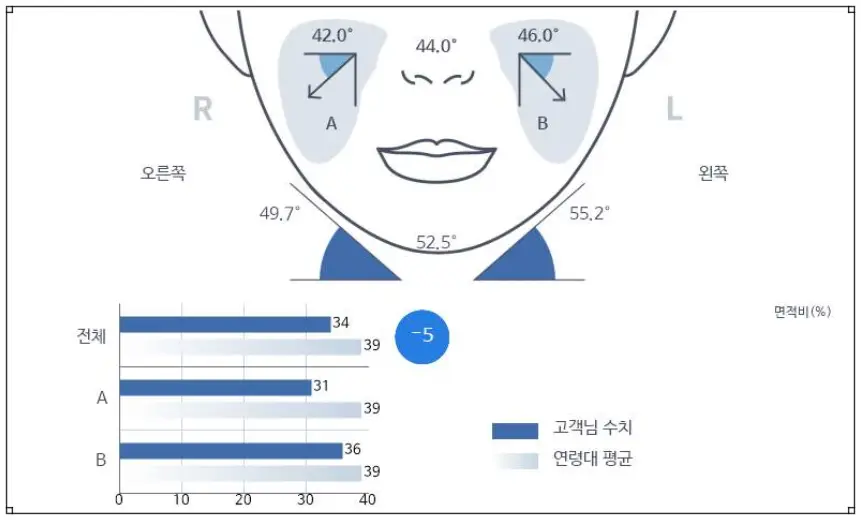 피부과에 방문했을 때 흔히 진행하게 되는 피부측정과 유사한데, 라운지에서는 바로 상담사 분이 자세하게 설명을 해주십니다. 더욱이 저와 유사한 연령대의 평균치와 비교해서 알려주시기 때문에 어느 부분에서 필요한 사항이 무엇인지를 바로 확인할 수가 있습니다.