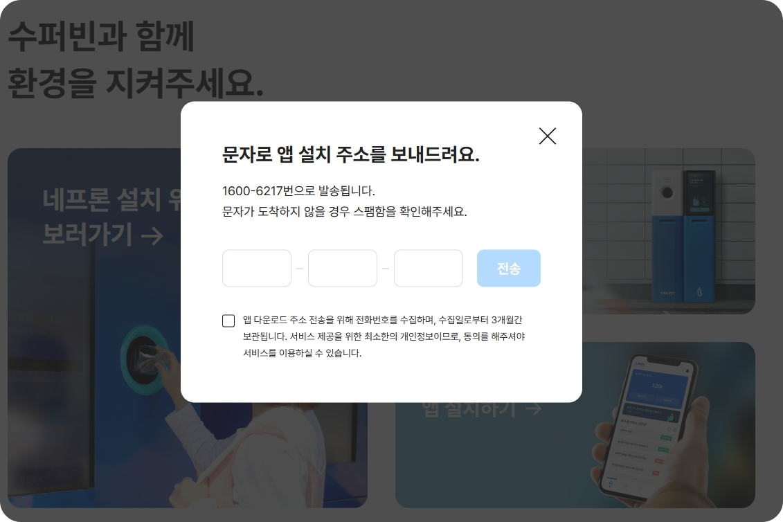 핸드폰에 수퍼빈을 검색하면 어플을 다운받을 수 있습니다. 또한 홈페이지에서 "수퍼빈 앱 설치하기"를 누르면 핸드폰 번호로 설치 주소를 받아보실 수 있습니다.